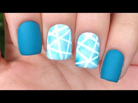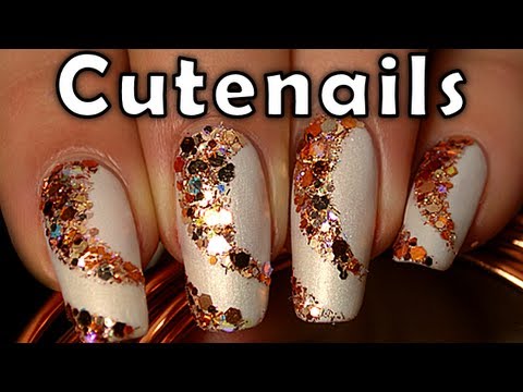Cute Nails Designs: Sweet Glittery Look. Apply a white base coat. Add two lines of liquid latex on either side of the nail. Apply some glittery nail polish to the sponge and press it over free of liqu