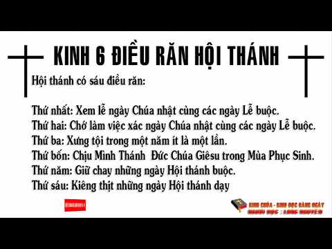 HỘI THÁNH CÓ SÁU ĐIỀU RĂN Thứ nhất: Xem lễ ngày Chủ nhật cùng các ngày lễ buộc. Thứ hai: Chớ làm việc xác ngày Chủ nhật cùng các ngày lễ buộc. Thứ ba: Xưng tội trong một năm ít là một lần. Thứ bốn: Ch