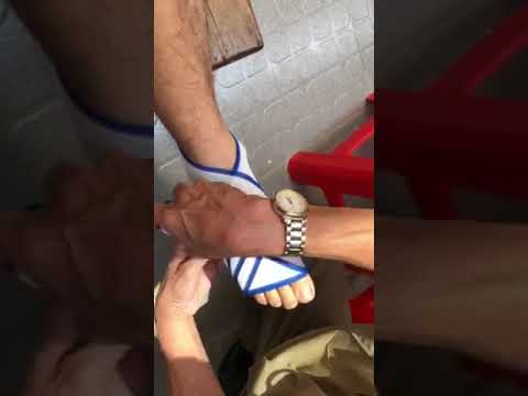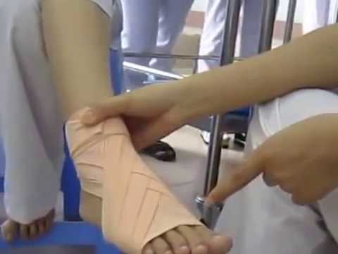 Băng 2 vòng đầu phía trên cổ chân cố định lên nhau để cố định đầu băng, sau đó đưa cuộn băng đi theo hình số 8, mặt băng cắt chéo nhau mặt trước cẳng chân, băng liên tiếp từ dưới lên trên nhiều vòng s
