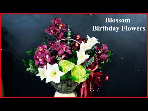 Giỏ hoa địa lan xanh gồm hoa địa lan xanh, hoa hồng môn tím, hoa phi yến tím, hoa lá phụ. Mẫu hoa khá bề thế và sang trọng. Nó được kết tinh từ loài hoa tinh tế của hoa lan và sự mềm mại của hoa hồng