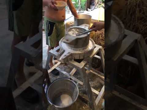 Nhà Có C. ố. i Xay B. ộ. t N. ướ. c. Cái cối xay bột nước lắp ráp xong chị Bông đã xay thử đậu nành rồi xay gạo thấy cả hai đều thành bột mềm nhuyễn đúng ý . Coi như chị đã "khai trương" cái cối xay b